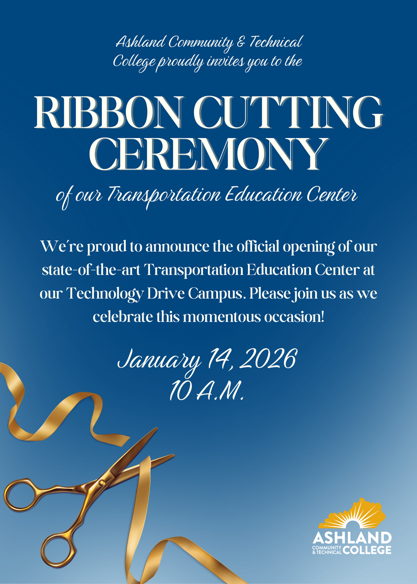 We are pleased to invite you to join Ashland Community & Technical College for a ribbon cutting ceremony celebrating the official opening of our new Transportation Education Center at our Technology Drive Campus. The event will take place on January 14, 2026, at 10:00 a.m.